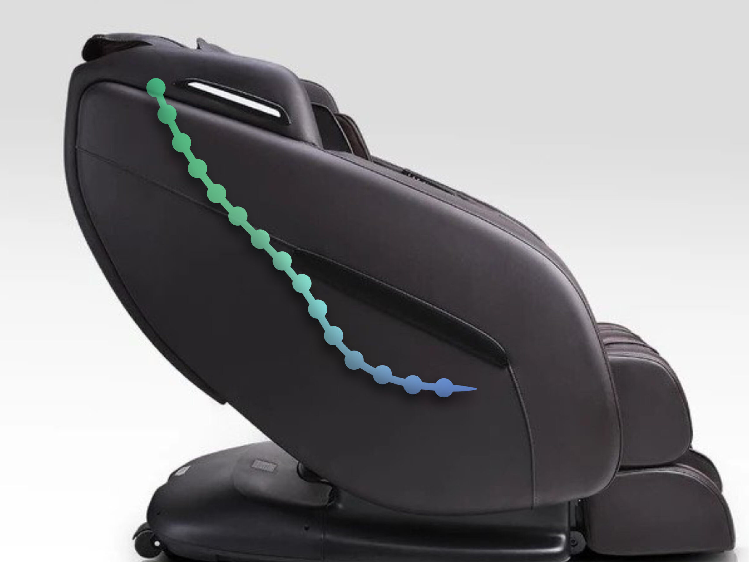 Traditionally, massage chairs take up a lot of space, especially when reclining. Most chairs require about two and a half feet of space behind the backrest in order for a full recline. The Ergotec base slides forward when reclining to save space in your home. This chair requires only six inches of space behind the backrest at any given position.