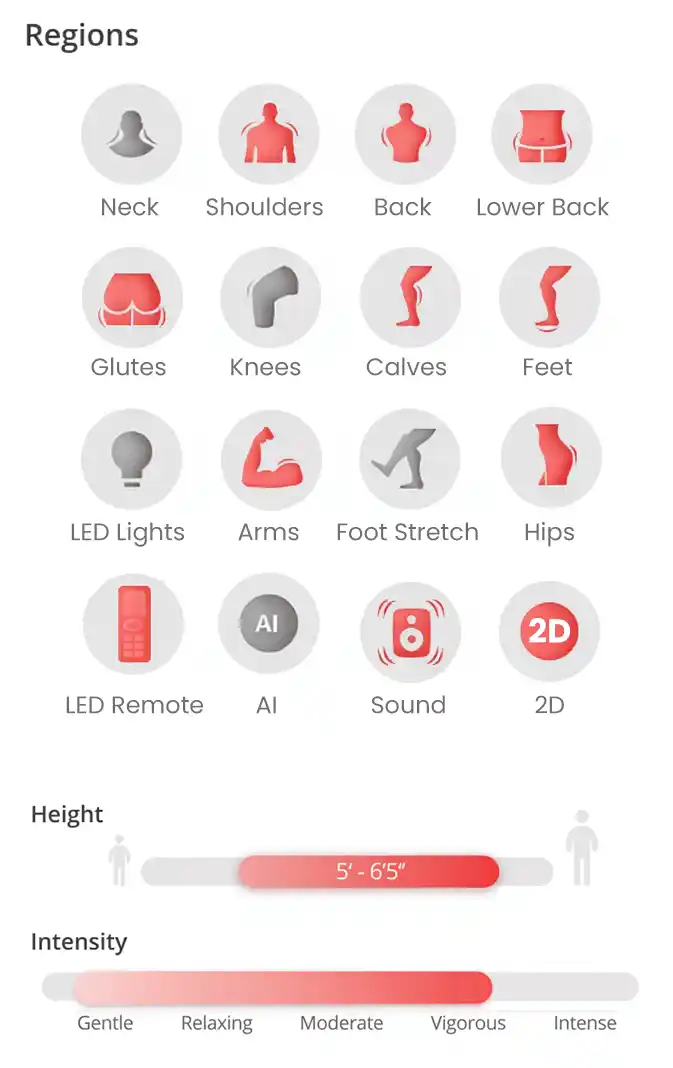 Surround sound speakers blend seamlessly into the headrest design and provide a soothing audio experience that complements your massage. These high-quality Bluetooth speakers easily connect to your smartphone or other smart device, allowing you to enjoy personalized music therapy and enhanced relaxation throughout your entire massage session.